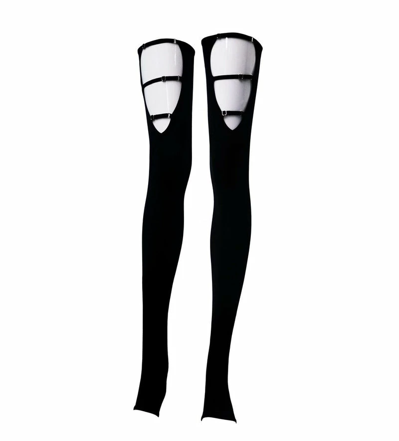 Thigh high stirrup leg warmers with adjustable strappy cage detail. These are a must!