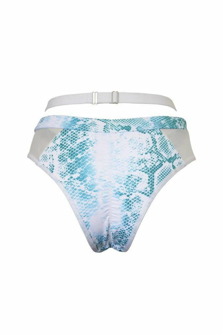 Pastel blue snake print on white gives this patternย a unique twist. White mesh panels and high waist strappy design with adjustable straps so they won’t dig in.