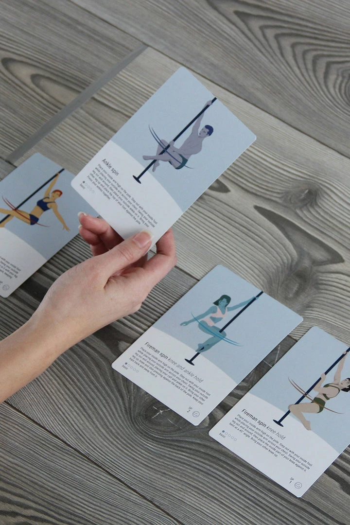 The Pole Deck Duo Pack (Basic Spins & Transitions and Climbs & Sits) is the perfect combination between elementary spins and first strength tricks. Climbs are an important part of pole dancing; they help you move up and down the pole with ease and grace. Pole sits allow you to work on your body strength and focus on your leg grip. The cards will give you the opportunity to explore different figures sitting on the pole, while experimenting with spins & transitions.