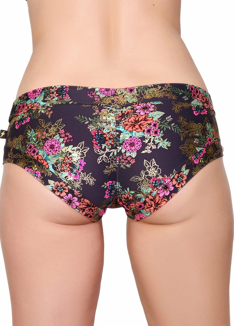 Sexy scrunch butt hot pants with wide crotch designed for pole dancers. Made with beautiful all-over gold foil print over dark grey matte fabric with signature Cleo Lightning Bolt label.