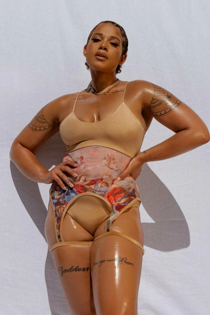 Constructed for movement, the garments aesthetic is soft and fabrics silky, however the garment still provides good support and coverage. This statement piece is only available in Golden.