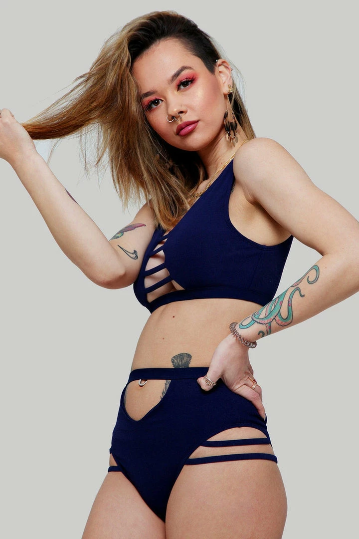 For the studio socialites, this high waist means business with peekaboo cut outs front and back and high-legged straps.