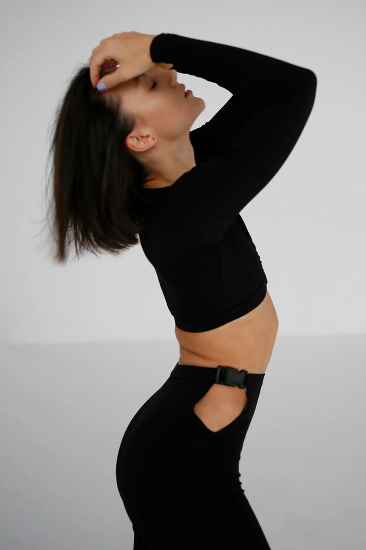 Styled with the Exo Wear Long Sleeve Buckle Front Top in Black!