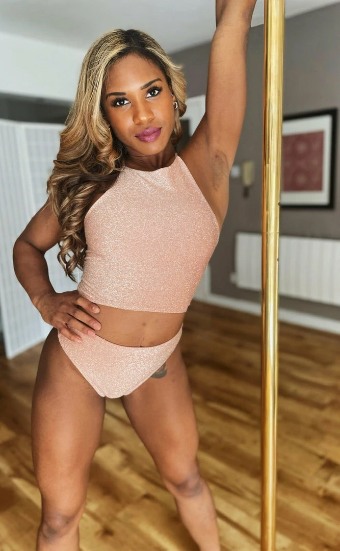Shimmer through your routine in this stunning high neck, lace back halter in rose gold lurex.