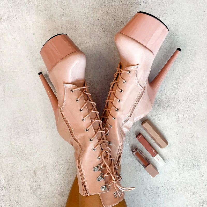 Glosssssy lipkit inspired creamy dreamy patent pink, with silver hardware, matching laces, and silver metal logo plate.
