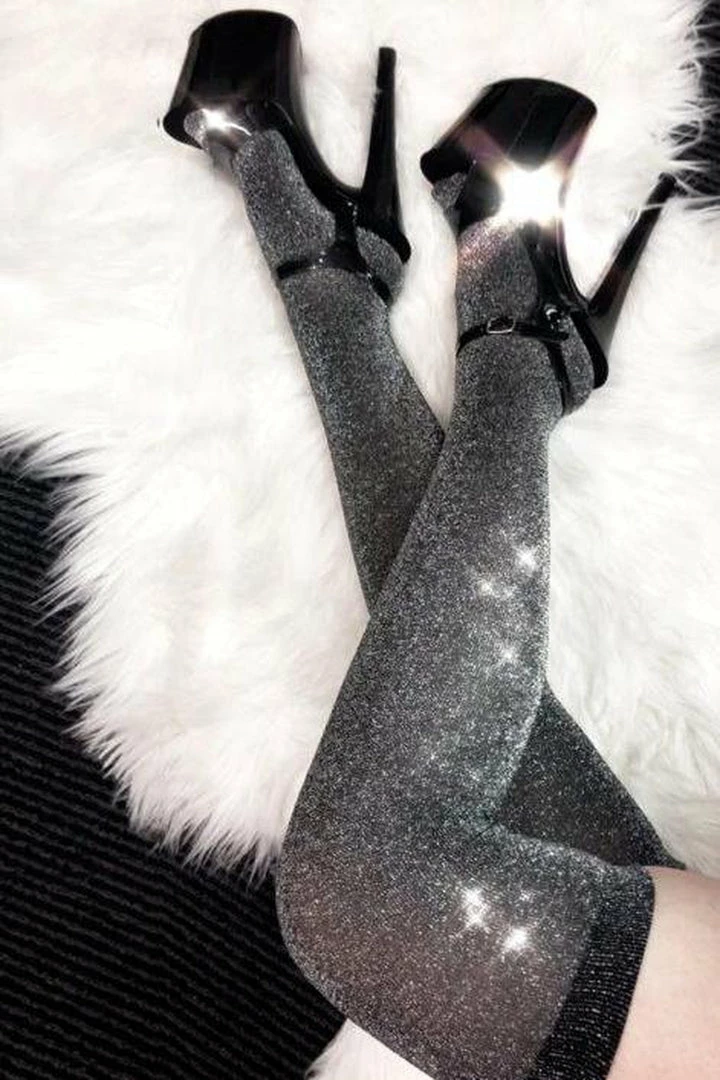 Add extra glam to your outfit with these Β black stretch cotton knit thigh high socks with a added shimmer. Perfect to glide comfortably across the floor for your fav #floorwerk routines!