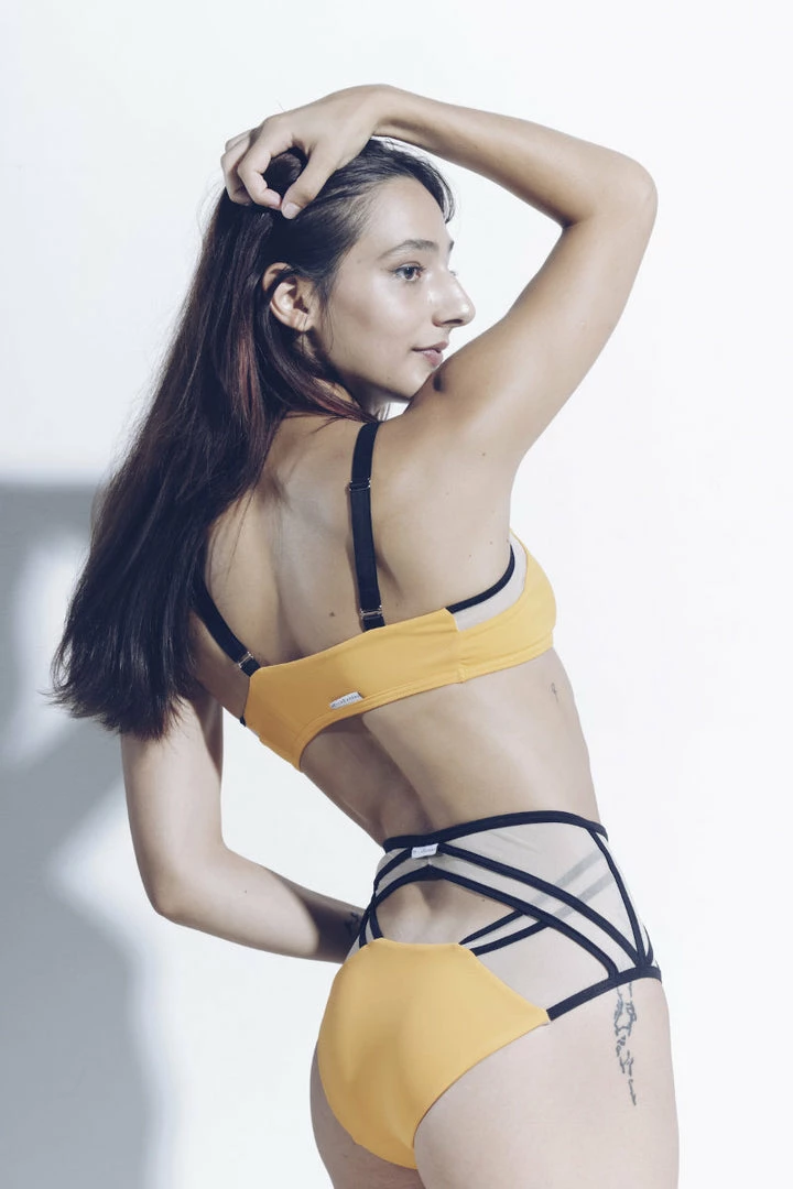 High-waisted bottoms with overlaid stripe mesh and attractive cutout details, our SILVIA bottom, implies a bold bottom line. Suitable for a variety of sport activities, such as pole dance, yoga, pilates, swimming.