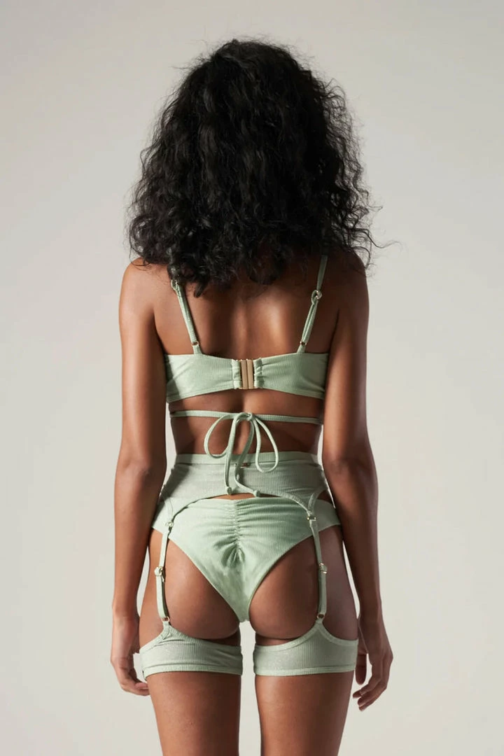 Featured here in a beautiful ribbed mint green fabric. Pair it with the OrianaΒ Shorts and Garter BeltΒ in Mint.