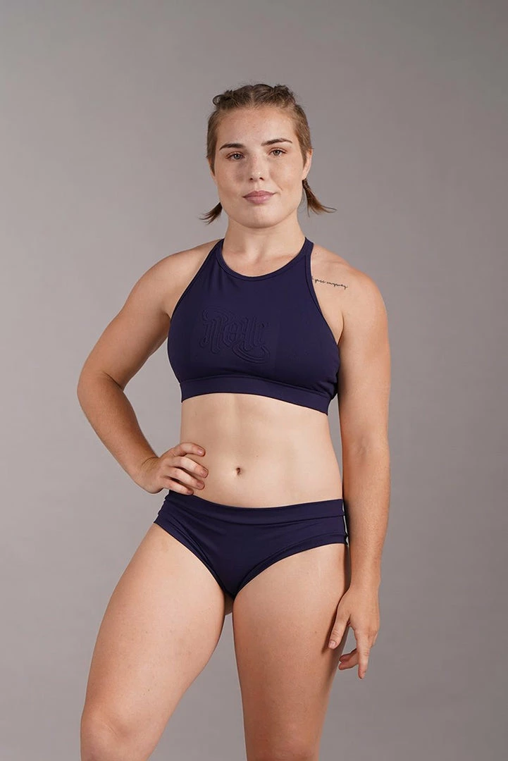 High neck sports bra featuring Sarah ScottβsΒ Ambigram Logo, read upside down as well as right way up in a subtle embossed print. This new design is supportive with a criss cross back to suit all body types.