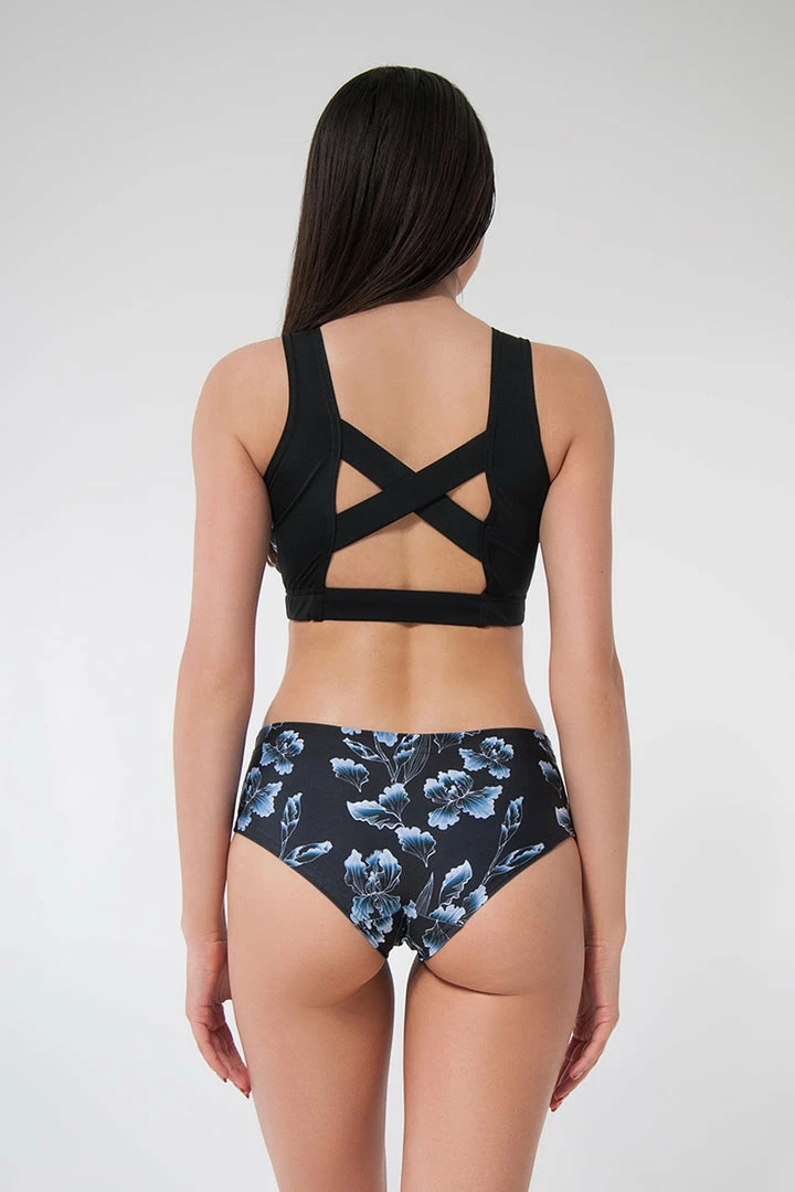 Looking for a full coverage, supportive top in a print you love? The Cross Back top is for you. Fully printed front with Black cross strap back.ย Matched here with the Odylia Hot Pants.