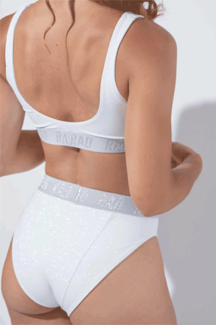 A very athletic and structured topΒ made with soft lurex fabric. It is completed with thick over the shoulders straps and a shimmering branded band for absolute support and comfort.Β Now available in pure white glitter.