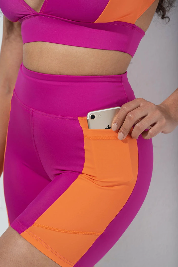 Meet the Ivy sports shortsย created from bright magenta and orangeย regenerated fabric. These sporty style shortsย are high waisted and offer full coverage and featureย super handy side pockets.