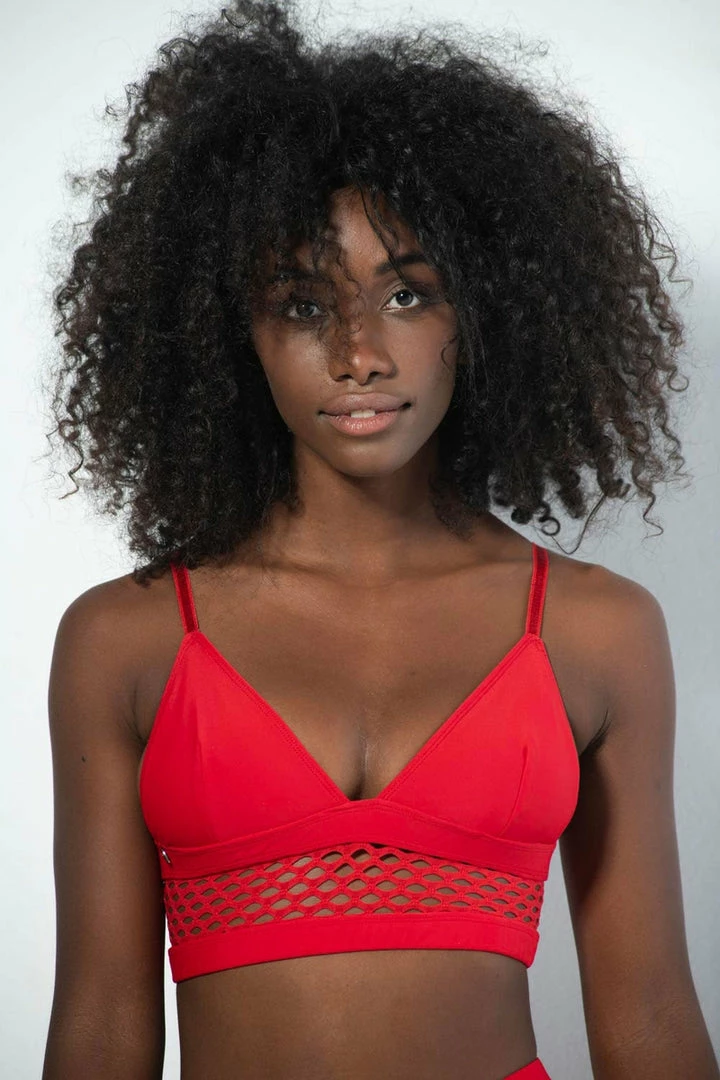 The Night top comes in black matte material and features thick mesh details and thin adjustable straps.