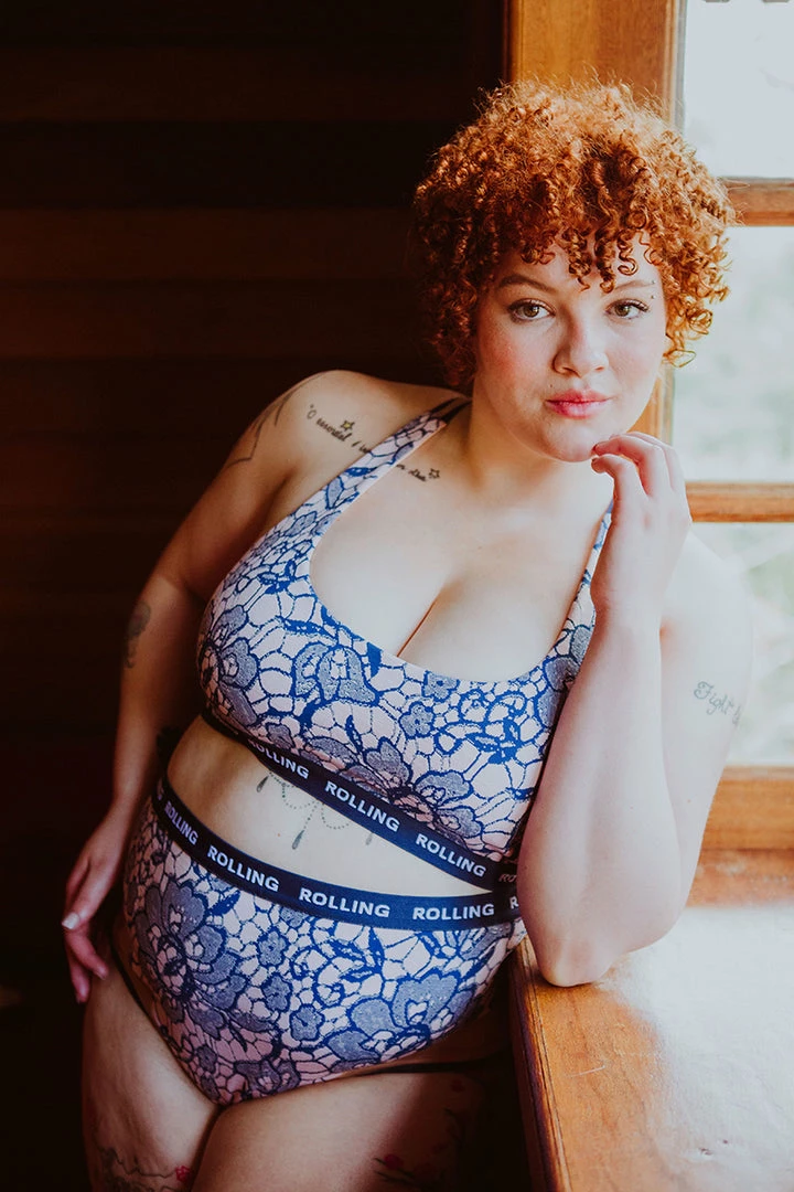Rolling’s signature Alpha sets are now available in summery florals! This scoop neck racer back top features a full mesh back and logo underbust band.