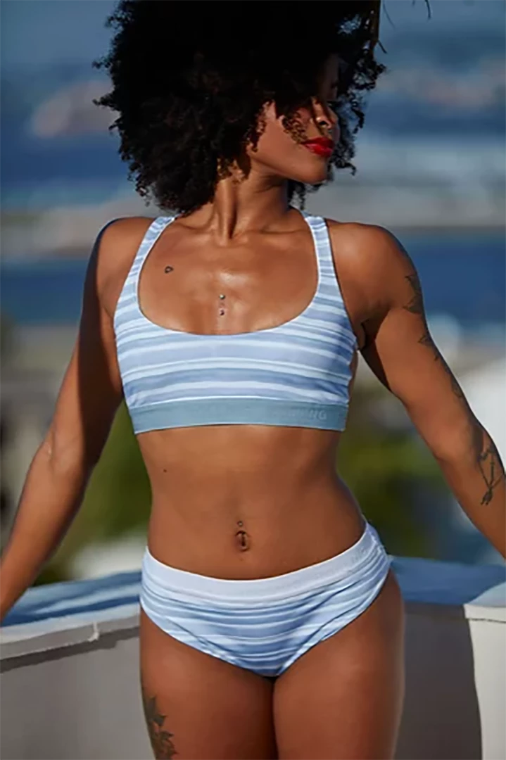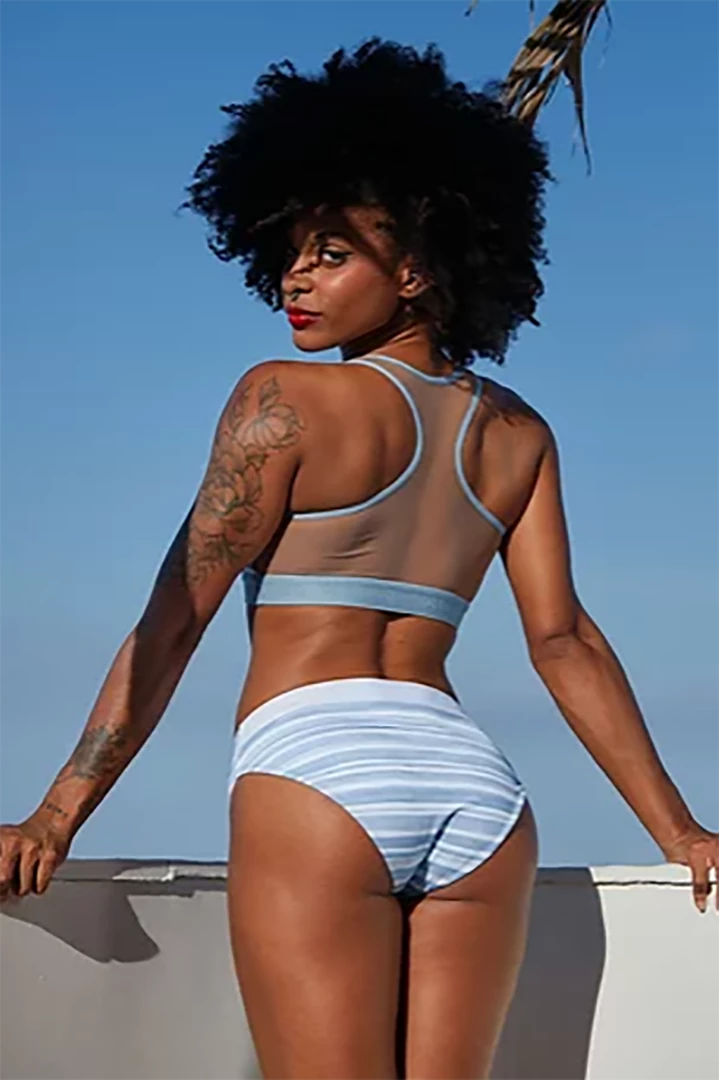 Rolling’s AlphaΒ Top features a swimmer necklineΒ with tulle back and custom blue elastic.Β This exclusive print comes from the stripes of sailors’ uniforms, but with a watercolor touch, evoking the waves and foam of the sea.