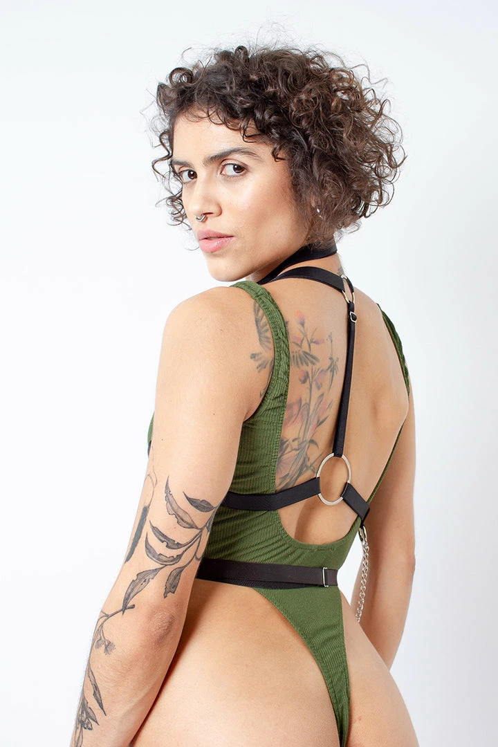 Styled with the Rolling Jane Bodysuit in Military Green and the Lara Bottom Harness in Black!