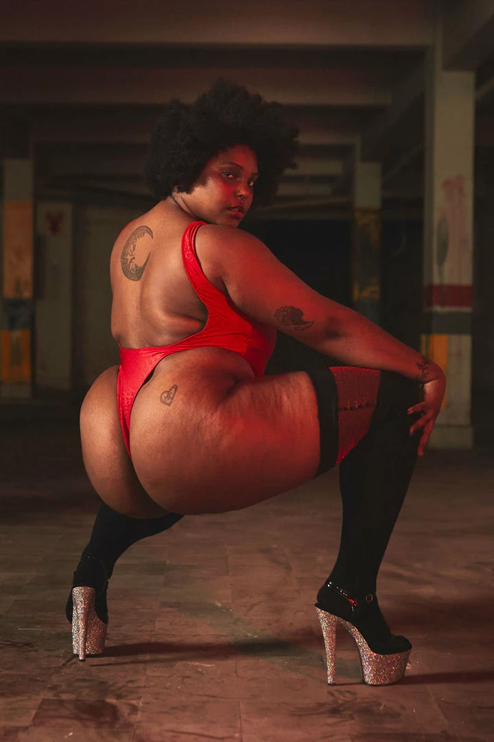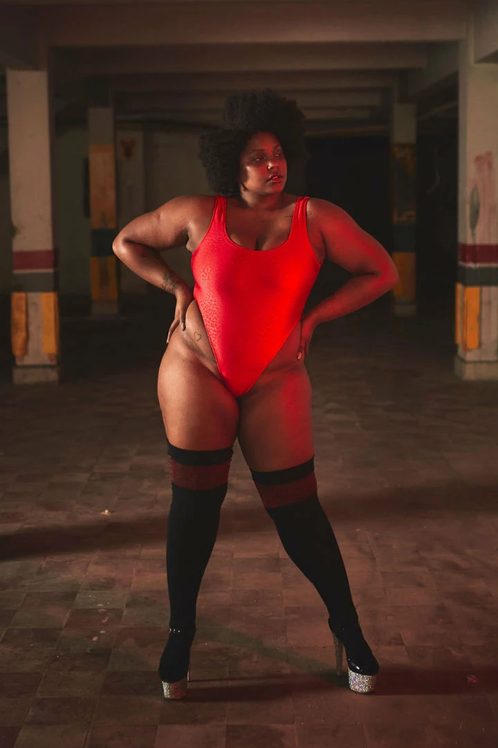 A high leg thongΒ bodysuit that can be worn in and out of the studio. Styled here over he knee socks.